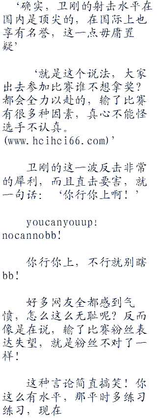 于是,卫刚又发了一条微薄:‘我卫刚练习射击已经好多年了,国际性比赛也参与过很多次了,还拿过射击比赛银牌,不过某人只会放放嘴炮,你行你上啊!’