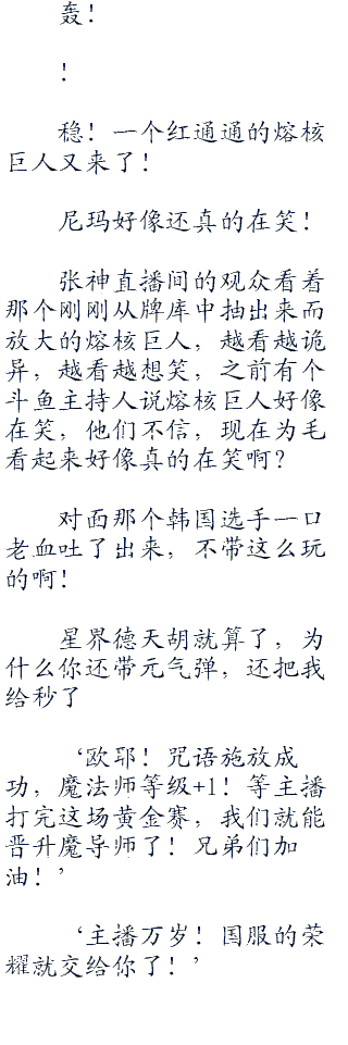 鱼大仙的一百多万空降观众惊呆了,他们一看游戏情况,张神现在是5费回合,手里捏着一张神圣愤怒,已经对准了对方英雄的脸,不过没有松手,像是在等待什么。