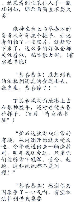 “首先,我要感谢炉石这款游戏,没有这款游戏我就没有站在这里(装逼)的机会,然后照例感谢cctv、感谢各位领导、感谢父母朋友和各位观众,还要特别感谢一下丁总赞助的法拉利。我以前就听说游戏玩得好可以脚踩祥云手提黄金、可以赚大钱泡洋妞开超跑,我现在告诉你们吧,我说的这些,统统都是真的!”