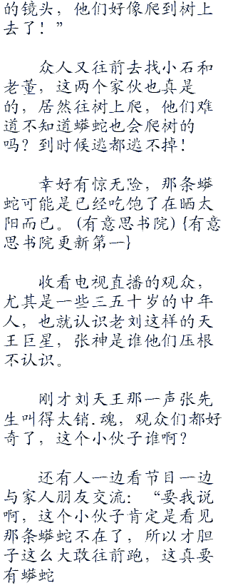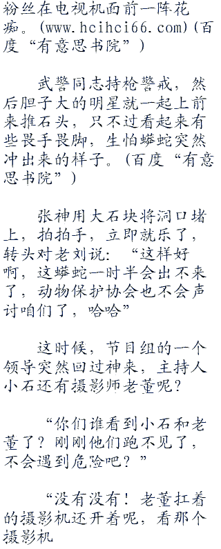 队伍里有好几个女明星听说有大蟒蛇,吓得急忙往后跑,顿时一片大乱。