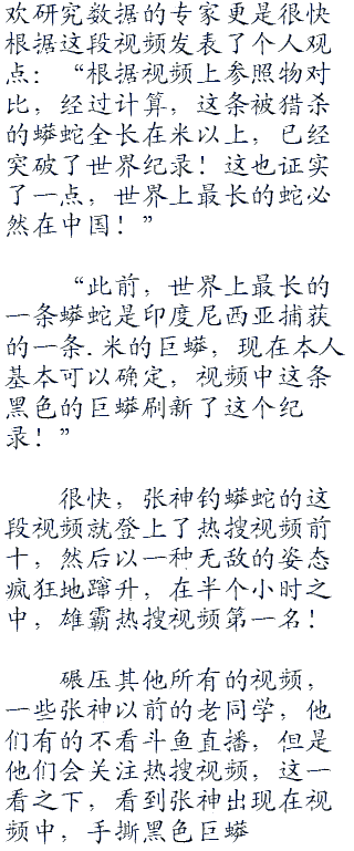 张神终于可以把他被吞下的右脚抽出来了,蟒蛇却还没有死,它还在垂死挣扎。