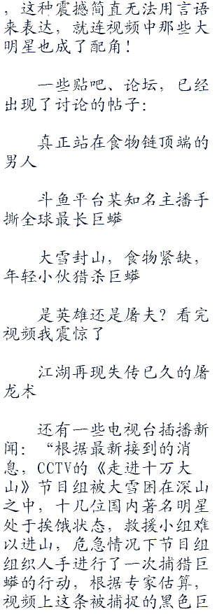剩下的人强忍着恐惧纷纷上前,张神连脚都敢让蟒蛇吞下,他们要是连抱住蟒蛇都不敢,那还算男人吗?