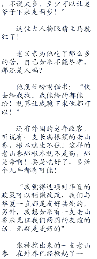 还有大人物的老父亲瘫在床上,手脚无力根本无法起身,做儿子的只能在眼睁睁的看着,给他父亲看病的医生欲言又止,最后还是告诉了他:“百年的老山参也许有用