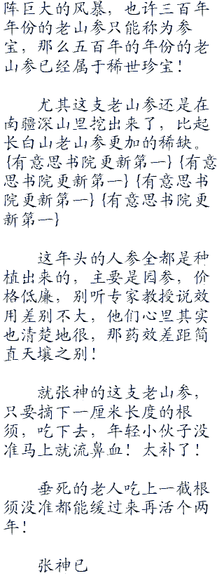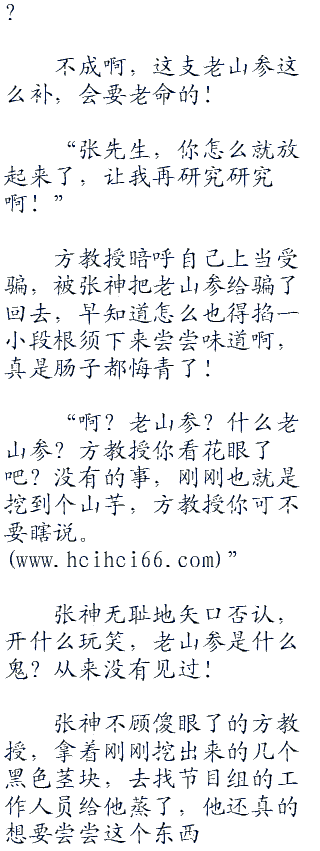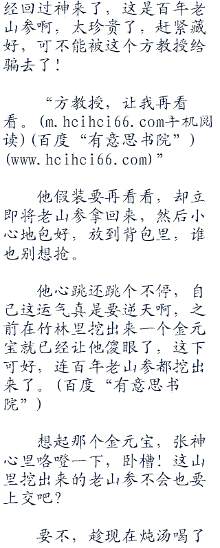 何家的何老太听下面的人报告说张神挖到一支五百年的老山参,顿时也激动起来了,她儿子手术之后一直会手脚发冷,医生说要找一支老山参做独参汤才行,可惜一直找不到满意的老山参,这下好了。
