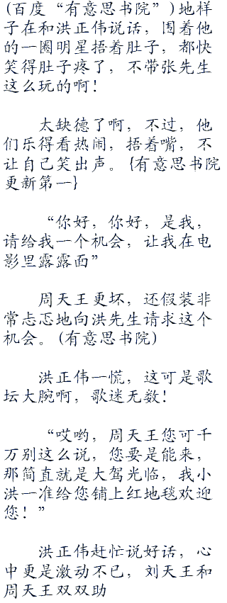 洪正伟心中一阵激荡,马上露出了谄笑,在电话里就开始拍马屁了:“刘天王,我是小洪啊!几年前你在拍那个什么电影的时候我还帮您送过盒饭的”