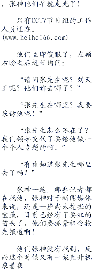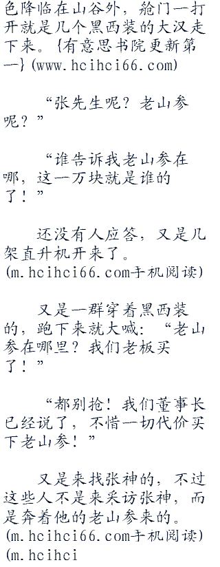 张神刚才打电话的时候,太阳就快落山了!不过他们已经没有心思再在深山里过夜,坐了直升机就离开了。