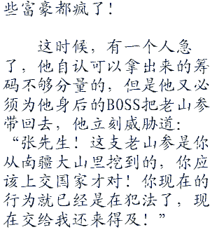 “张先生,请你一定要把老山参卖给我啊,不然我家老板就要我提头回去见他了”