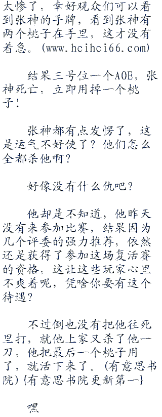 张神也是有一点压力的,如果没有选到好的武将的话,他想要赢真的很难,因为这场复活战,可以有两名失败的选手复活,参加到最终之战,所有选手都是实力强大的种子选手。