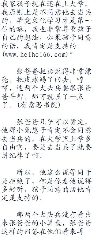 这是要请她儿子去当司令啊还是军长啊?居然每年还能休假三个月,骗人也认真点啊!从来就没有听说过当兵能休假三个月的!