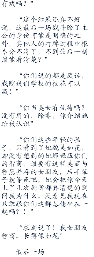 全国那么多观众看着呢,说好了一局定胜负的,他们只有权力对每个选手进行评分,然后根据最后的评分选出优胜的选手。