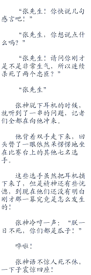 观众们这个时候已经吵翻天了,因为张神这是要连杀两个忠臣啊!