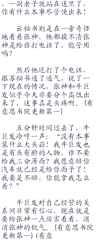 果然,牛巨发一抬眼皮子,语气颇为生硬:“你就是那姓张的吧?我也不跟你计较,你那车子我会派人给你弄好,你死要钱的话别说十万八万,给你二