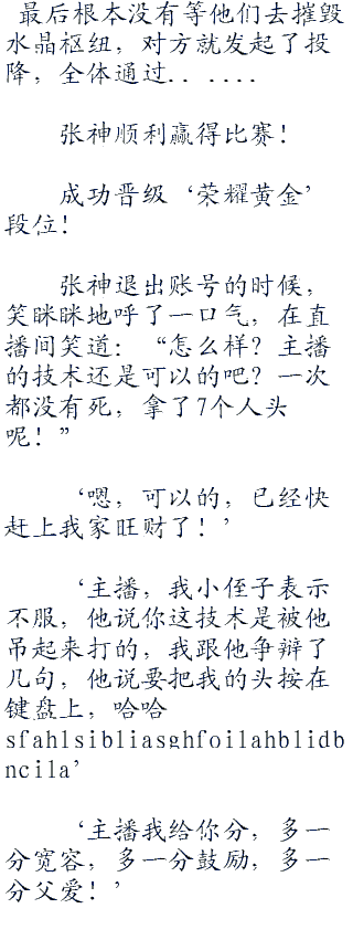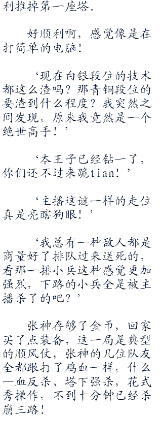 小兵才刚刚出发,张神这边刚刚因为失恋而准备挂机的队友,听说队长准备在胜利后把珍藏多年的宝贝传给他,顿时像打了鸡血一样的,凶猛无比!眨眼将敌方英雄干翻在地!