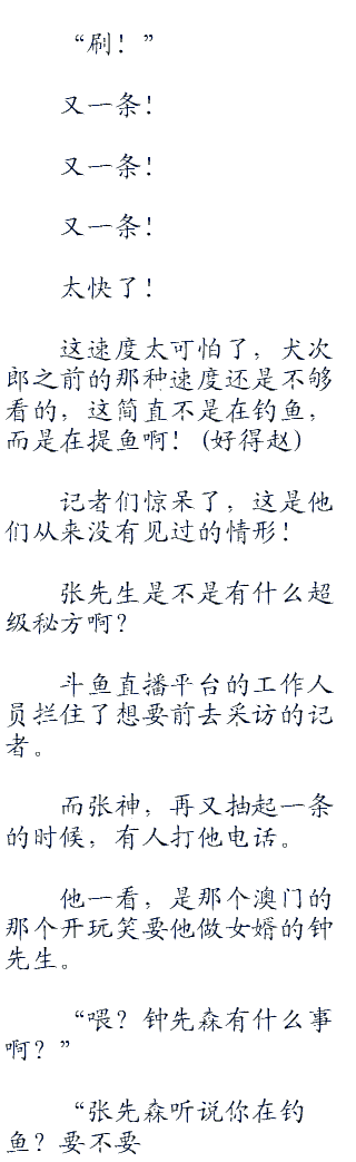 只见徐宝山气沉丹田扎了个马蹲,死死抱住了张神,老王和小蜗牛同学一起冲过来帮张神拉钓竿。