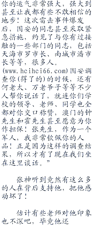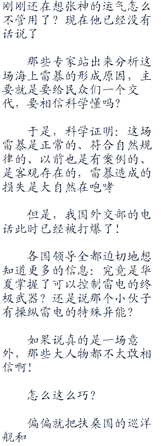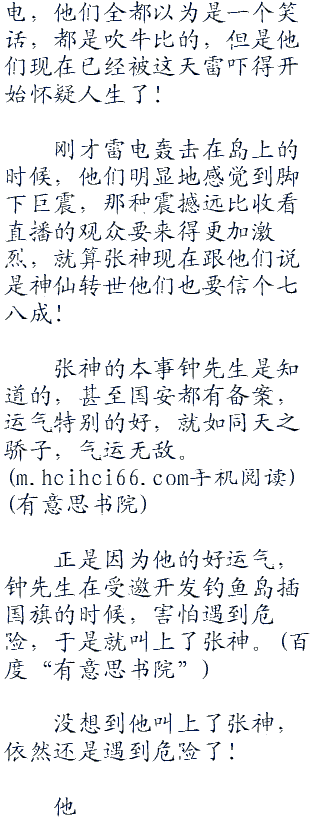 钓鱼岛上,钟先生目瞪口呆,半天回不过神来,那个电视台派遣过来的女主持都忘记哭了,眼睛瞪得老大,摄影师把摄影机一直对准了张神,一句话都说不出来。