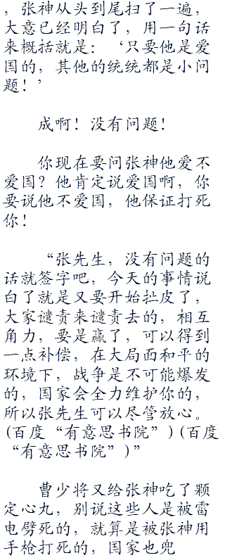“抗拒从严回家过年吗?嗨!那都是说笑的,没有那回事,国家只是要了解国内的人才、精英,像张先生你这样的,以后是可以得到优待的,尤其是你家庭清白,我猜张先生肯定是一个爱国人士!”