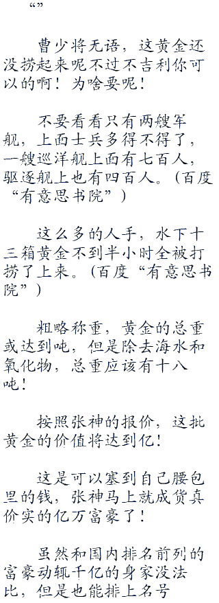 相比于张神的潜水能力,海军士兵哪一个都要比他强,沉船很快就被找到,然后巡洋舰上放下了绳索,开始全力打捞黄金。