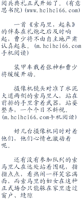 岛屿上的广播里传来了艾迪特的声音,他用索马里语和阿拉伯语先后通报了一遍,要求排练过的索马里青壮年按照排练时的队列在水泥大道的左右两侧列队!