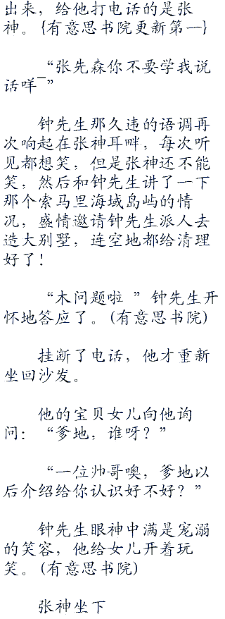 电话接通,张神抢先说道:“钟先森,海边大别墅咩?”