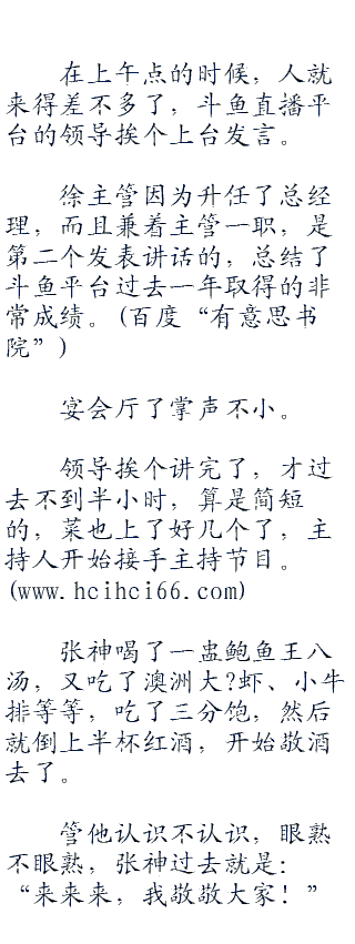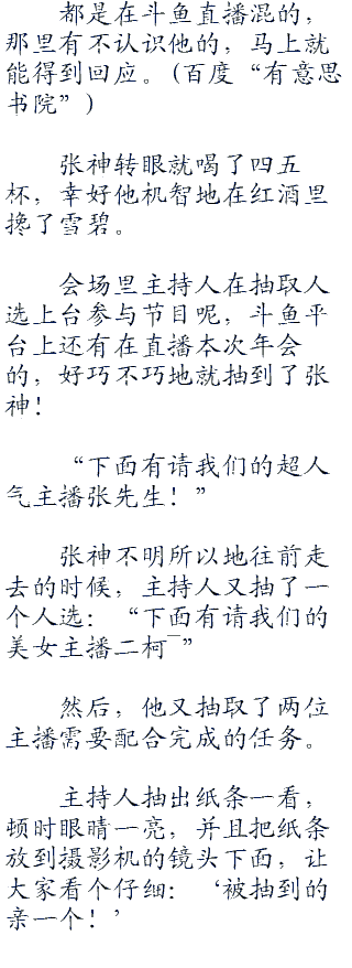徐主管坐下之后,像是话唠一样跟张神谈天说地,从年会讲到游戏,再从游戏讲到各个主播,甚至还给张神讲了一些平台女主播的八卦。首发
