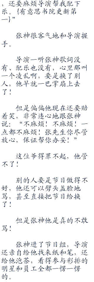 张神赶到春晚节目组的时候,已经是下午的事情了,他因为不是节目组导演自己定的人选,而是上面指定的,所以他给节目组导演打了个电话之后,导演还亲自跑出来接他。