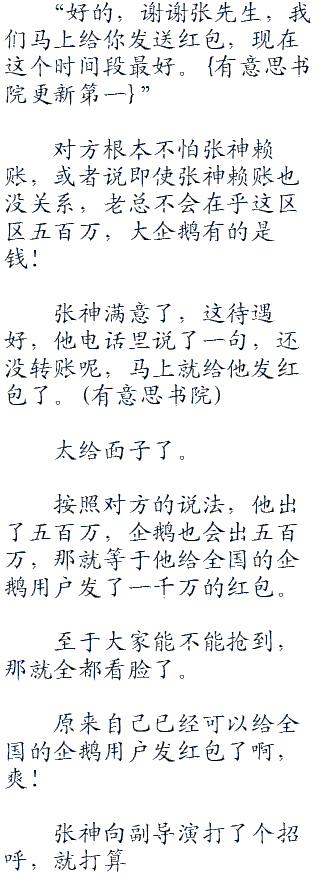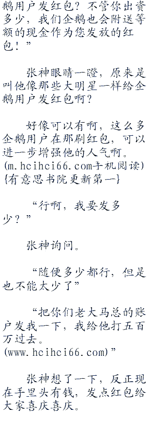 张神笑着鼓励道,任谁抢红包抢了几万块都会像他一样对这个活动很满意的。