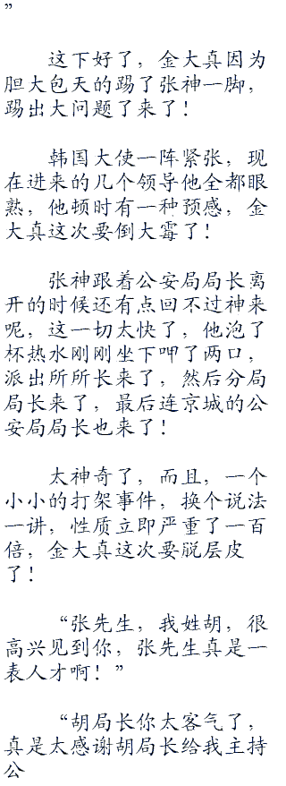 一副很严肃认真的样子,打架,尤其是没有造成伤残的,并不能构成刑事事件,所以韩国大使馆的律师并不是很担心,先把人带走了,后续的事情慢慢扯嘛,最多就是进行经济赔偿了。
