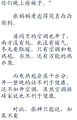 “累了吧?等下早点睡,穿这点衣服不冷吗?去换件小棉袄穿上。”