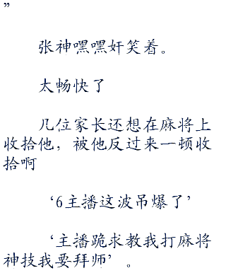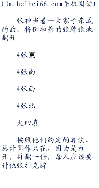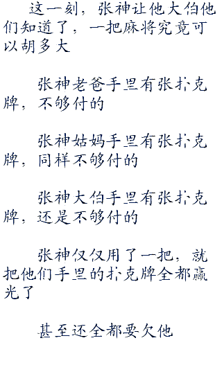 张神把牌理好,默默地看着他老爸洋洋得意地掷骰子,心说等下子看你还笑不笑得出来