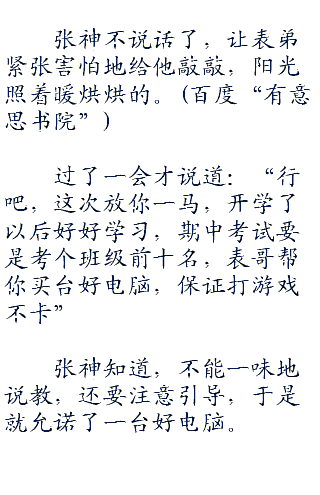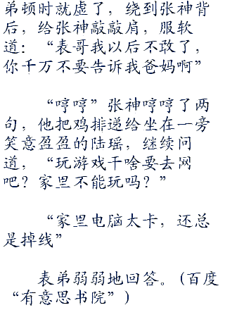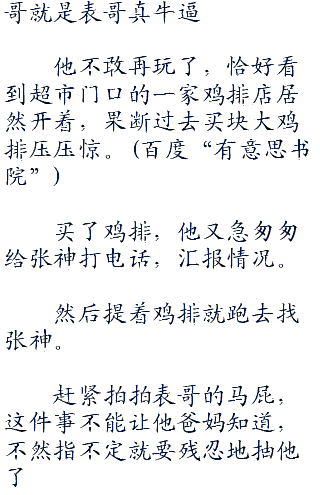 张神在电话却先安慰他:“现在不要紧张,深呼吸你认识网吧老板对吧?那就不要慌,镇定点走下去,然后对老板说:‘舅舅,给我二十块,我要去买鸡排吃’考验你演技的时候到了你是带着鸡排回来,还是我去派出所领你回来,就看你自己的表现了。”