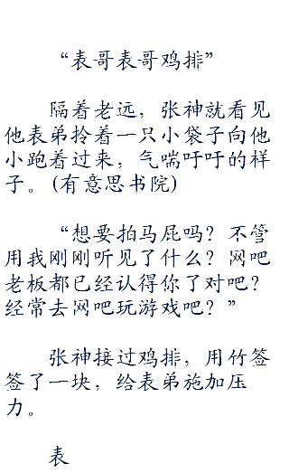 张神表弟一脸高兴地跑到老板面前:“老舅老舅给我二十块我要去买鸡排吃”